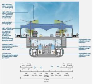 Η Allison Albericci οραματίστηκε την Εγνατία Οδό ως ένα διαδραστικό δρόμο με πολλά επίπεδα, στο χώρο και στο χρόνο, που θα λειτουργεί ως χρηστικός και πολιτιστικός οδηγός για πολίτες και επισκέπτες. Πως; Αξιοποιώντας ένα δίκτυο αισθητήρων που θα “επικοινωνεί” με τα «έξυπνα» τηλέφωνα των χρηστών του δρόμου και του μετρό.Οι αισθητήρες θα συλλέγουν πληροφορίες για την κίνηση των ΙΧ, των λεωφορείων και των συρμών του μετρό, θα “χαρτογραφούν” τις μετακινήσεις των πεζών (πόσοι, πότε, προ τα που), παρέχοντας χρήσιμα δεδομένα για τη βελτίωση του κυκλοφοριακού συστήματος της πόλης, ενώ διαδραστικές οθόνες αφής θα βοηθούν τους επιβάτες να βρουν τη βέλτιστη διαδρομή για έναν προορισμό. Τα δεδομένα για την πυκνότητα της κίνησης θα μπορούν να αξιοποιηθούν και για λόγους μάρκετινκγ (της ίδιας της πόλης, εμπορικών προϊόντων κλπ) ενώ φωτεινές επιγραφές και ψηφιακές πλάκες πεζοδρομίου θα “εκπέμπουν” ενημερώσεις για πολιτιστικές εκδηλώσεις στα “έξυπνα” τηλέφωνα όσων περνούν από το σημείο. Κάτω από τη γη, κατά μήκος του μετρό, σε τοίχους και δάπεδα, σε εισόδους και σταθμούςόλες οι στρώσεις ιστορία της πόλης θα “ζωντανεύουν” με διαδραστικά ψηφιακά εκθέματα, έτσι ώστε περιμένοντας στη στάση ή βλέποντας από το παράθυρο του τραίνου ο επιβάτης να βλέπει ξαφνικά τον Γναίο Εγνάτιο να τρέχει πάνω στο άλογό του!2.Πανοραμικό αστικό παιχνίδι