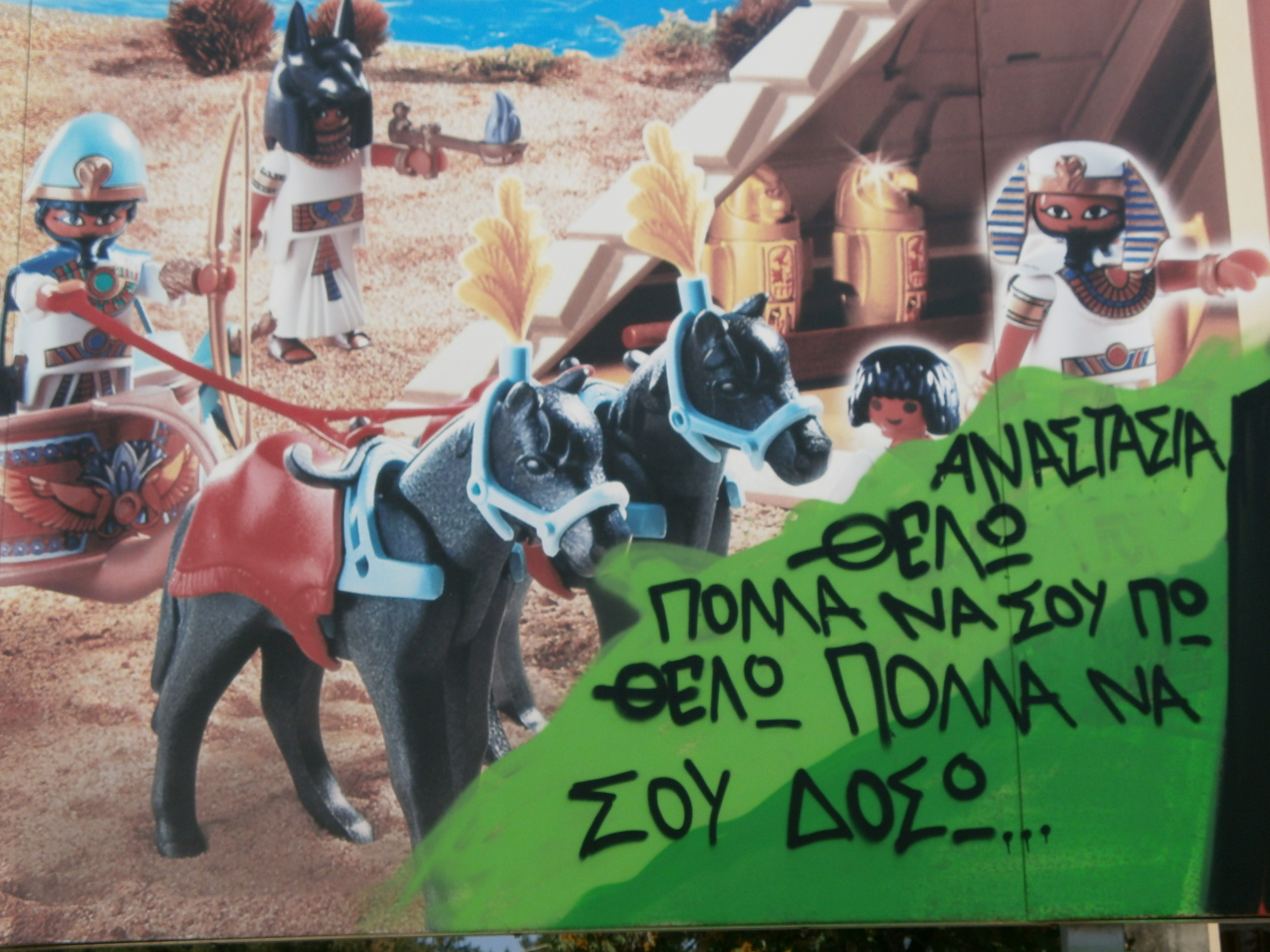 Μήνυμα πάνω σε διαφήμιση playmobile, στα ΚουΚου αεροδρομίου (Φωτό:  Σοφία Χριστοφορίδου, 9 Ιουνίου.2012)