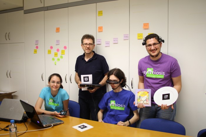 -SymbioSpace: Οι ασθενείς ξεχνούν τη χρησιμότητα καθημερινών αντικειμένων (όπως ένα πιάτο ή ένα μαχαιροπίρουνο). Μέσω του προγράμματος, και με την κατάλληλη σήμανση τα αντικείμενα αυτά μπορούν να “προβάλλουν” ένα βίντεο πάνω στην επιφάνεια ειδικών γυαλιών οράσεως με ενσωματωμένη κάμερα, που να υπενυμίζει στους ασθενείς τι είναι και πως χρησιμοποιούνται. Με τον ίδιο τρόπο, και οι άνθρωποι που φέρουν τη σχετική σήμανση (πχ στην οθόνη του κινητού τους) μπορούν να «προβάλλουν» στα γυαλιά των ασθενών εικόνες από το παρελθόν (που τους είναι πιο οικείες) «υπενθυμίζοντας» τη μεταξύ τους σχέση.