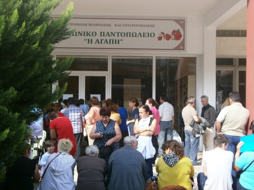 Ηλικιωμένοι, μεσήλικες, μάνες με παιδιά σχημάτιζαν ουρές έξω από το παντοπωλείο της μητρόπολης Νεαπόλεως- Σταυρουπόλεως, επί της Λαγκαδά, στις «δωδεκαόροφες». Περιμένοντας στη στάση του λεωφορείου, μπροστά από το παντοπωλείο «Η Αγάπη» έβγαλα στα κλεφτά μια φωτογραφία. «Σε είδα που έβγαζες φωτογραφία». Μόλις που πρόλαβα να ψελλίσω ότι φρόντισα να μη φαίνονται τα πρόσωπα τους και με έπνιξαν σαν χείμαρρος τα λόγια και τα δάκρυά της.