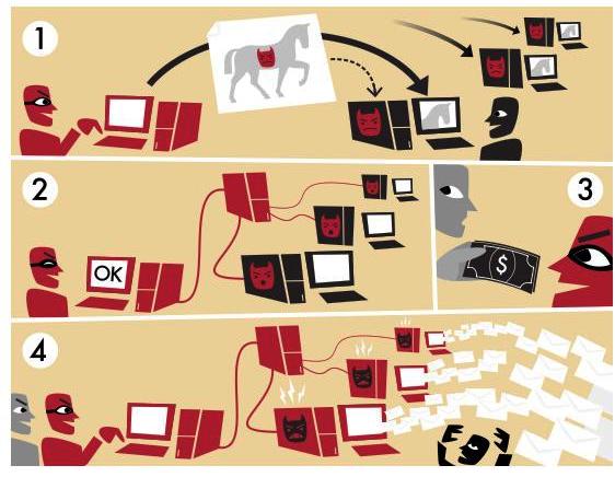 03. Botnets. Μεγάλος αριθμός υπολογιστών που έχουν προσβληθεί από κακόβουλο λογισμικό παύουν να ελέγχονται από τον νόμιμο χρήστη και, στη θέση του, ελέγχονται από χάκερς, κυρίως για (α) μαζική αποστολή spam-scam emails, (β) εκτέλεση DDoS attacks, (γ) εκτέλεση brute force attacks σε πληροφοριακά συστήματα, (δ) χρήση κατά τη διάρκεια pharming απάτης, µε συνεχή δημιουργία νέων απατηλών κλώνων σε διαφορετικά σημεία ανά τον κόσμο. Τα μεγαλύτερα botnets που έχουν καταγραφεί αριθμούσαν έως και 30 εκατ. Η/Υ!