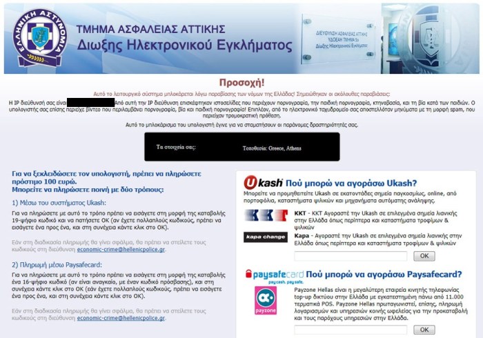 01. Ιός «ransomware» ή, κοινώς, ο «ιός των 100 ευρώ». Οι υπολογιστές όσων επισκέπτονται ροζ ιστοσελίδες προσβάλλονται από κακόβουλο λογισμικό, που μπλοκάρει όλες τις λειτουργίες του υπολογιστή και εμφανίζει μήνυμα ότι, δήθεν, η Δίωξη Ηλεκτρονικού Εγκλήματος επέβαλε πρόστιμο 100 ευρώ για αδικήματα του Ποινικού Κώδικα. Στο πλαίσιο αυτό, ζητείται η πληρωμή του προστίμου με χρήση καρτών paysafe ή ucash.