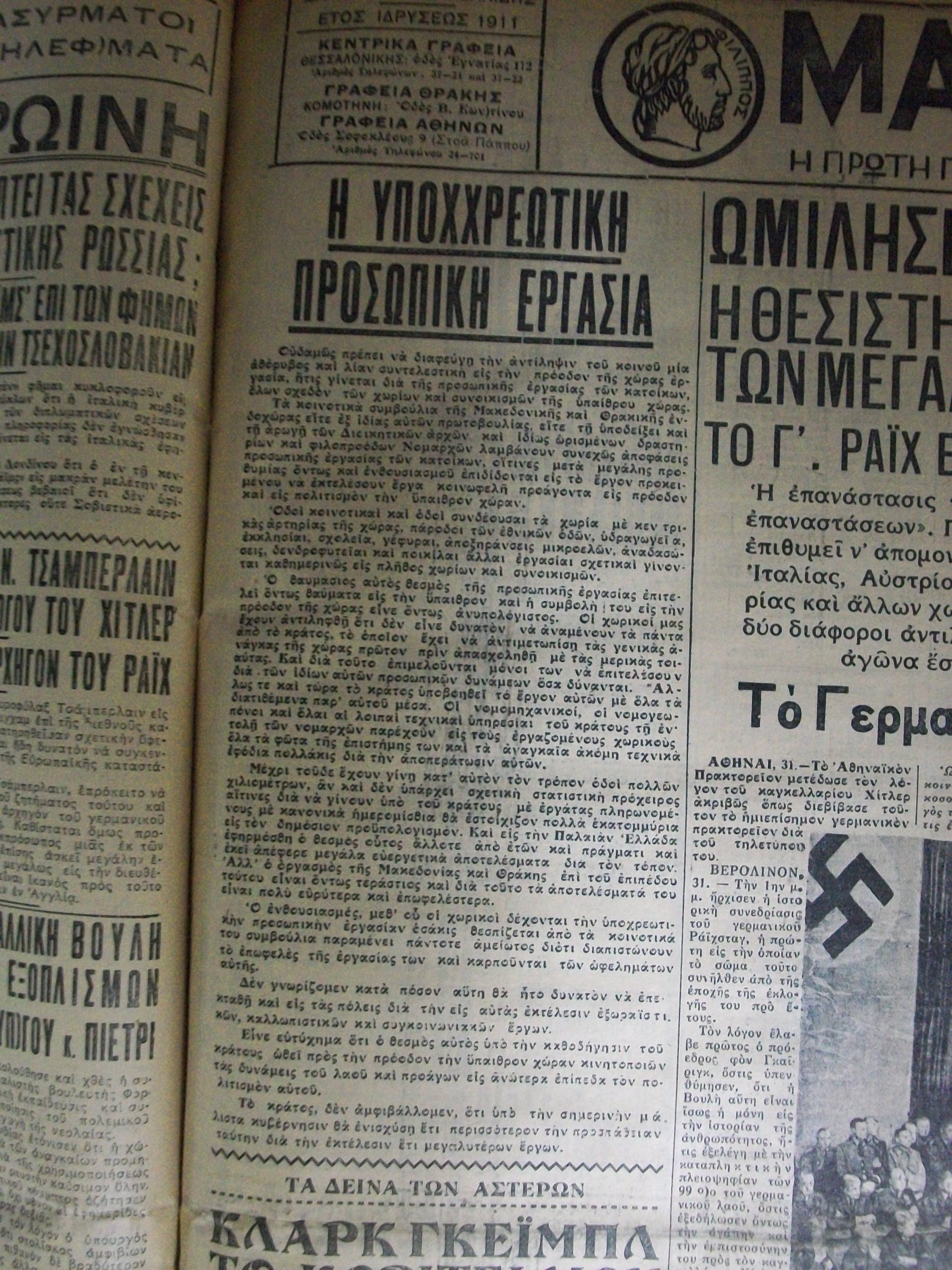 Τελευταία περνάω τα πρωινά μου στο αρχείο της «Μακεδονίας» για τις ανάγκες της διπλωματικής μου εργασίας. Ξεφυλίζοντας τα πρωτοσέλιδα σκάλωσε το μάτι μου στο φύλλο της 31η Ιανουαρίου 1937 και ανατρίχιασα… Η «Μ» κυκλοφορεί με πρωτοσέλιδο κύριο άρθρο (κάτι που σπανίως κάνει η εφημερίδα, μετά το 1935) το οποίο τιτλοφορείται «Η υποχρεωτική προσωπική εργασία» όπου μεταξύ άλλων κάνει λόγο για «μια αθόρυβο και λιαν συντελεστική εις την πρόοδον της χώρας εργασία, ήτις γίνεται δια της προσωπικής εργασίας των κατοίκων. Τα κοινοτικά συμβούλια της Μακεδονικής και Θρακικής ενδοχώρας… λαμβάνουν συνεχώς αποφάσεις προσωπικής εργασίας των κατοίκων οίτινες μετά μεγάλης προθυμίας όντως και ενθουσιασμού επιδίδονται εις το έργο προκειμένου να εκτελέσουν έργα κοινωφελή προάγοντα εις πρόοδον και εις πολιτισμόν την ύπαιθρον χώρα» και λίγο παρακάτω ζητά επέκταση του μέτρου και στις πόλεις: «Δεν ξέρουμε κατά πόσον αύτη (σ.σ η υποχρεωτική εργασία) θα ήτο δυνατόν να επεκταθή και εις τας πόλεις δια την εις αυτάς εκτέλεσιν εξωραϊστιών, καλλωπιστικών και συγκοινωνιακών έργων».