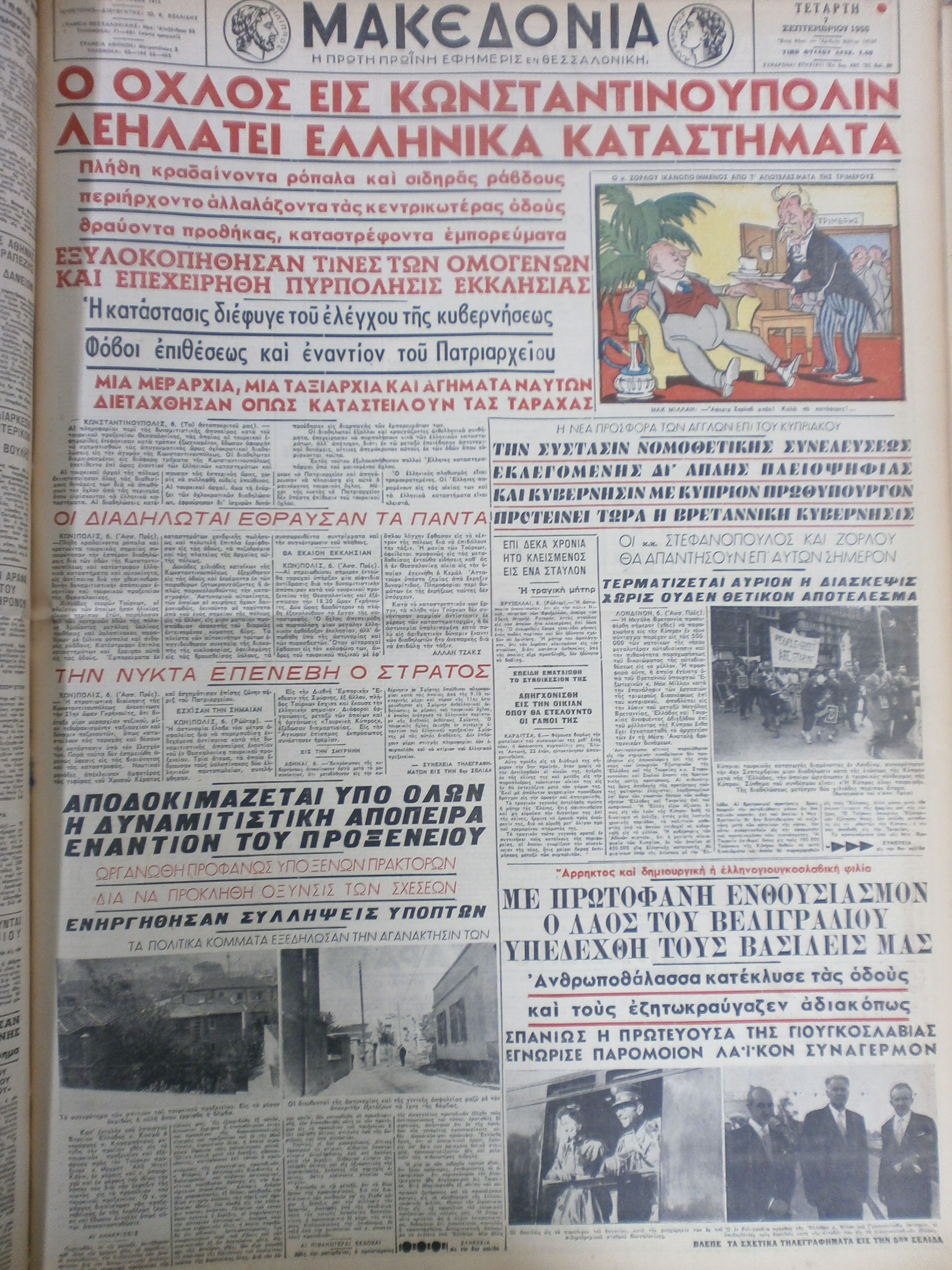 Στις 9 Σεπτεμβρίου 1955 η εφημερίδα καλύπτει το πρωτοσέλιδο με τις φωτογραφίες από τις καταστροφές και οκτάστηλο τίτλο: «Ρηματική διακοίνωσις εις Άγκυραν. Εις απόγνωσιν οι ομογενείς μας», «Περί τα 2.500 ελληνικά καταστήματα κατεστράφησαν υπό του αφηνιασμένου όχλου εις Κωνσταντινούπολιν» και λεπτομερές ρεπορτάζ στις εσωτερικές σελίδες. Την επομένη το πρωτοσέλιδο καλύπτεται από νέες συγκλονιστικές φωτογραφίες από το πογκρόμ, με αποκαλυπτικό ρεπορτάζ στις εσωτερικές σελίδες. Ακολουθούν εκτενή ρεπορτάζ για το θέμα, που πλέον λαμβάνει διεθνείς αλλά και εσωτερικές πολιτικές διαστάσεις: