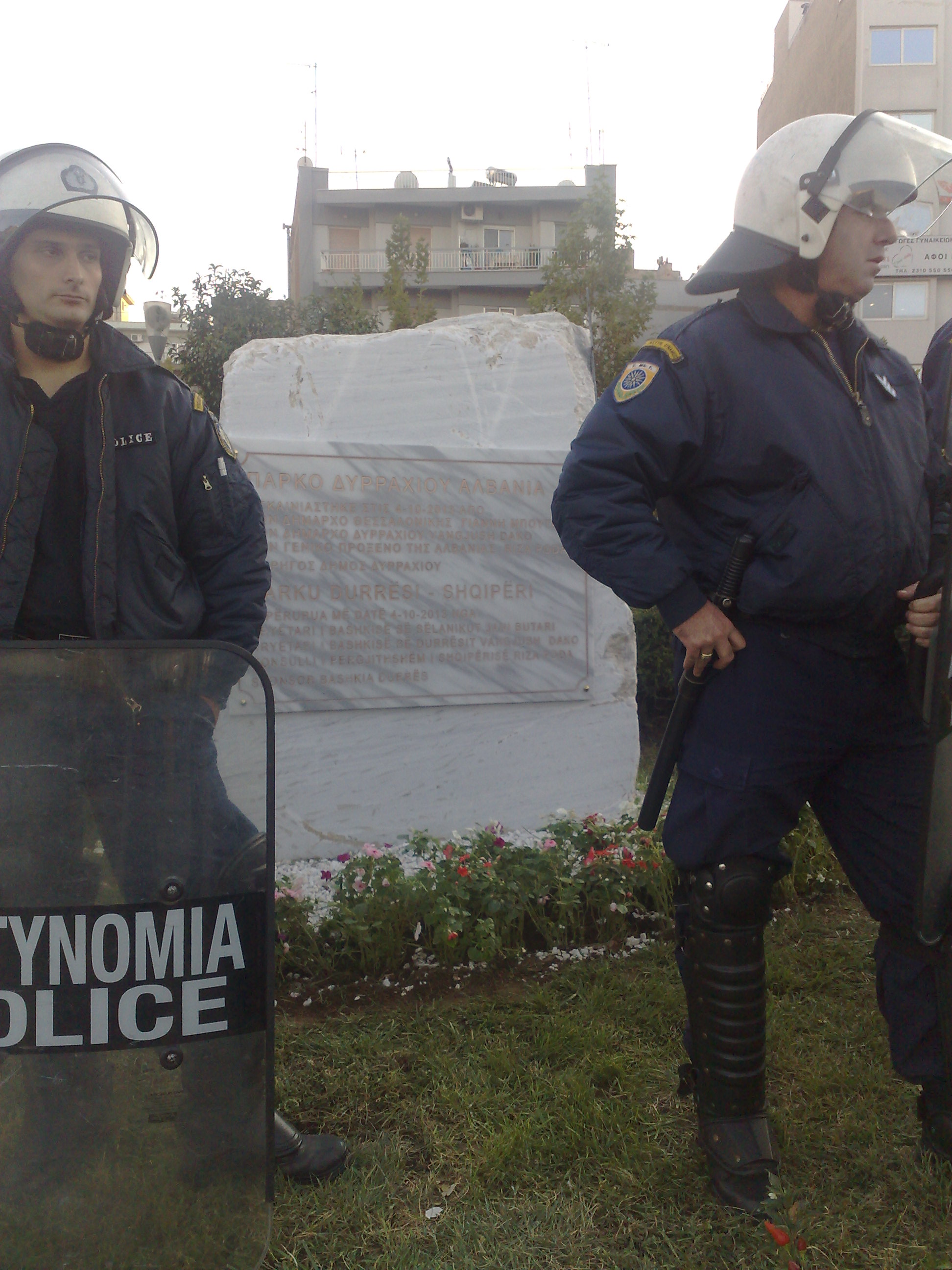 Εκεί λοιπόν αποφάσισε ο δήμος Θεσσαλονίκης να εδραιώσει την φιλία με την αδελφοποιημένη πόλη, το Δυρράχιο Αλβανίας. «Κλίμα ειρήνης και συνεργασίας καλλιεργούν μόνο οι σχέσεις καλής γειτονίας, δηλαδή η λεγόμενη διπλωματία των πόλεων και όχι οι πολιτικές διαφωνίες» σημείωσε ο Γιάννης Μπουτάρης κατά τη διάρκεια της συζήτησης με τον ομόλογό του από το δήμο Δυρραχίου, Βανγκιούζ Ντάκο. Λίγο αργότερα, έκαναν τα αποκαλυπτήρια μιας στήλης που τοποθετήθηκε στην πλατεία, παρουσία ισχυρής αστυνομικής δύναμης. Σε απόσταση οι χρυσαυγίτες, που έβριζαν κραδαίνοντας ελληνικές σημαίες, σε απόσταση αλλά από την απέναντι πλευρά οι Αλβανοί της γειτονιάς. Εκεί βρέθηκαν καμιά εικοσαριά-τριανταριά κάτοικοι της περιοχής, εν εξάλλω .