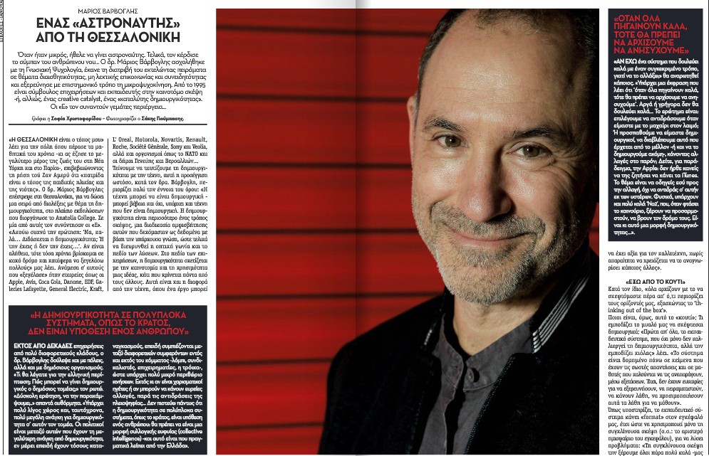 “Η ΘΕΣΣΑΛΟΝΙΚΗ είναι ο τόπος μου” λέει για την πόλη όπου πέρασε τα μαθητικά του χρόνια -κι ας έζησε το μεγαλύτερο μέρος της ζωής του στη Νέα Υόρκη και στο Παρίσι-, επιβεβαιώνοντας τη ρήση τού Ζαν Αμερύ ότι “πατρίδα είναι ο τόπος της παιδικής ηλικίας και της νιότης”. Ο δρ. Μάριος Βάρβογλης επέστρεψε στη Θεσσαλονίκη, για να δώσει μια σειρά από διαλέξεις με θέμα τη δημιουργικότητα, στο πλαίσιο εκδηλώσεων που διοργάνωσε το Anatolia College. Σε μία από αυτές τον συνάντησαν οι “Ε”.