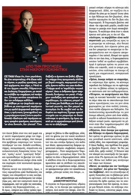 “Τι θα λέγατε για την ελληνική περίπτωση; Πώς μπορεί να γίνει δημιουργικός ο δημόσιος τομέας;” τον ρωτώ. “Δύσκολη ερώτηση, να την παρακάμψουμε;..” απαντά αυθόρμητα. “Υπάρχει πολύ λίγος χώρος και, ταυτόχρονα, πολύ μεγάλη ανάγκη για δημιουργικότητα σ’ αυτόν τον τομέα. Οι πολιτικοί είναι μεταξύ αυτών που έχουν τη μεγαλύτερη ανάγκη από δημιουργικότητα, εν μέρει επειδή έχουν τόσους καταναγκασμούς, επειδή συμπιέζονται μεταξύ διαφορετικών συμφερόντων εντός και εκτός του κόμματος -λόμπι, συνδικαλιστές, επιχειρηματίες, η τρόικα-, ώστε υπάρχει πολύ μικρό περιθώριο κινήσεων. Εκτός κι αν είναι χαρισματικοί ηγέτες ή αν μπορούν να κάνουν ευρείες αλλαγές, παρά τις αντιδράσεις της πλειοψηφίας… Δεν πιστεύω πάντως ότι η δημιουργικότητα σε πολύπλοκα συστήματα, όπως το κράτος, είναι υπόθεση ενός ανθρώπου: θα πρέπει να είναι μια μορφή συλλογικής ευφυίας (collective intelligence) -και αυτό είναι που πραγματικά λείπει από την Ελλάδα”.