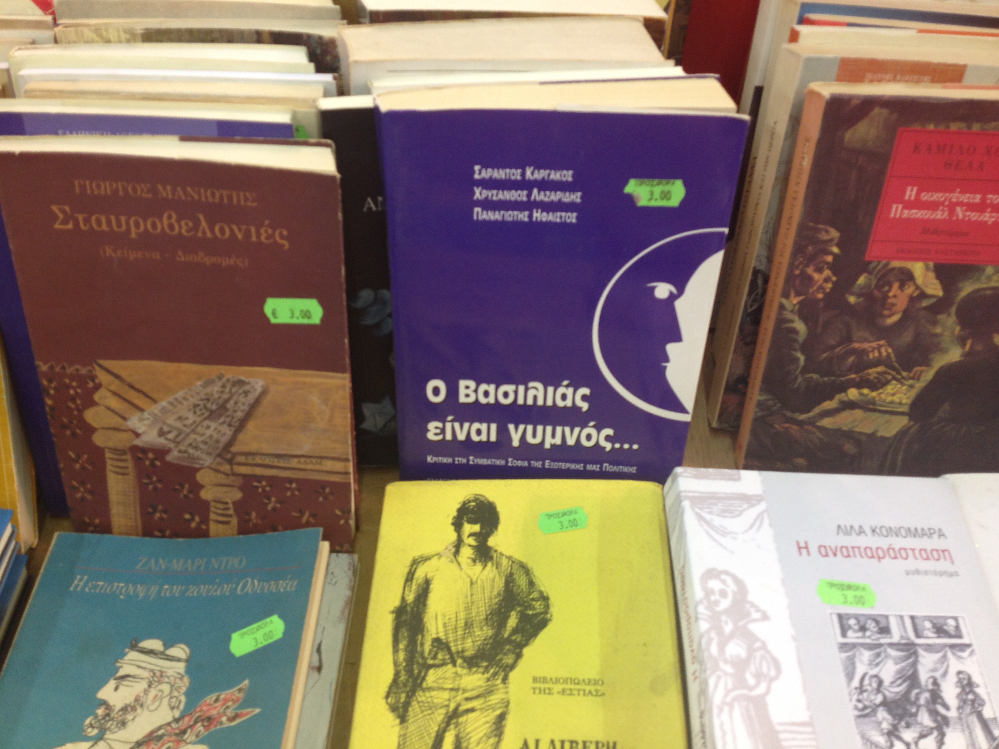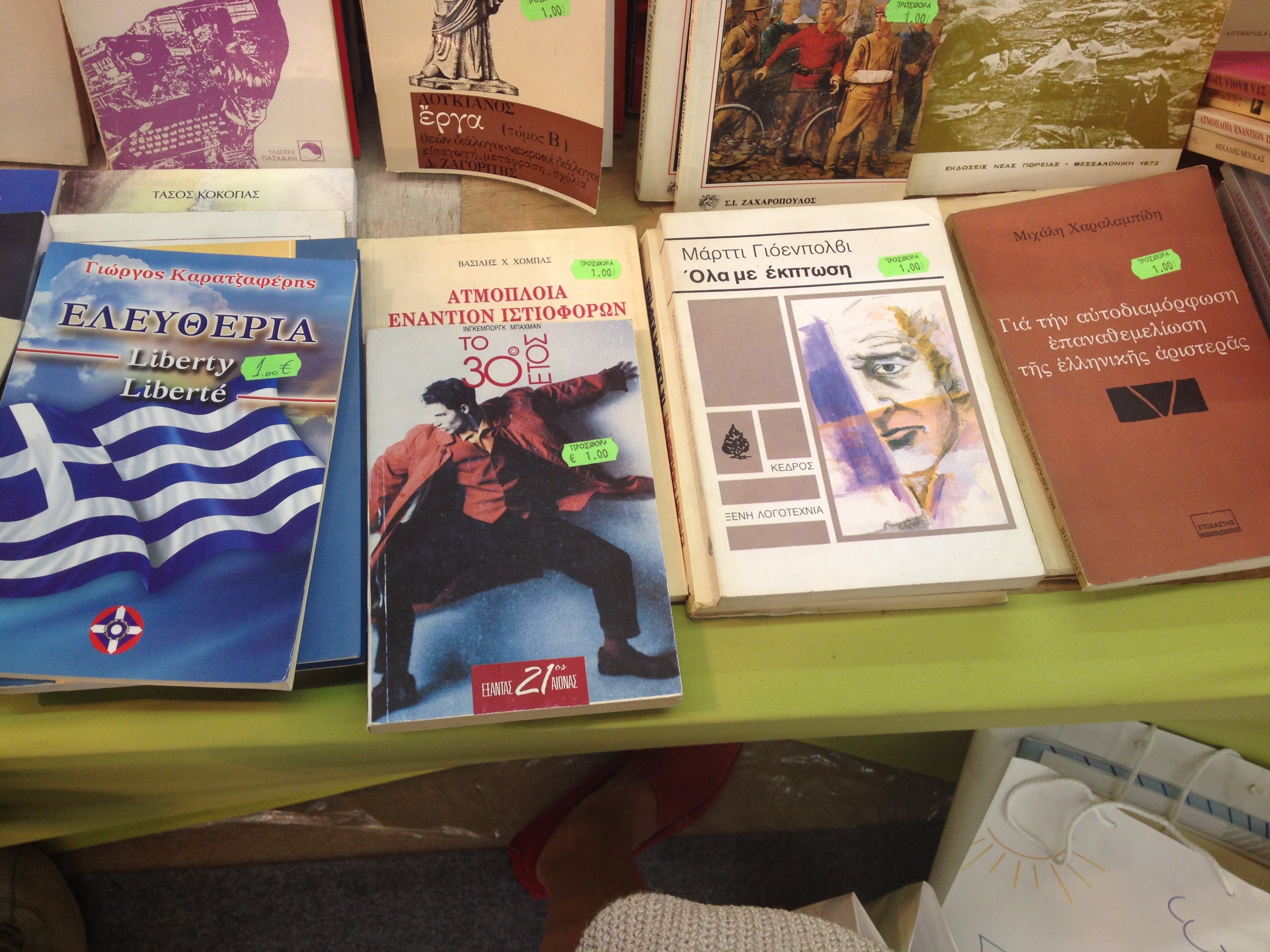 «Ελευθερία/Liberty/Liberte»του Γιώργου Καρατζαφέρη και παραδίπλα «για την αυτοδιαμόρφωση, επαναθεμελίωσηση της ελληνικής αριστεράς» του Μιχάλη Χαραλαμπίδη (δεν ξέρω του πότε είναι, αλλα είναι γραμμένο σε πολυτονικό)